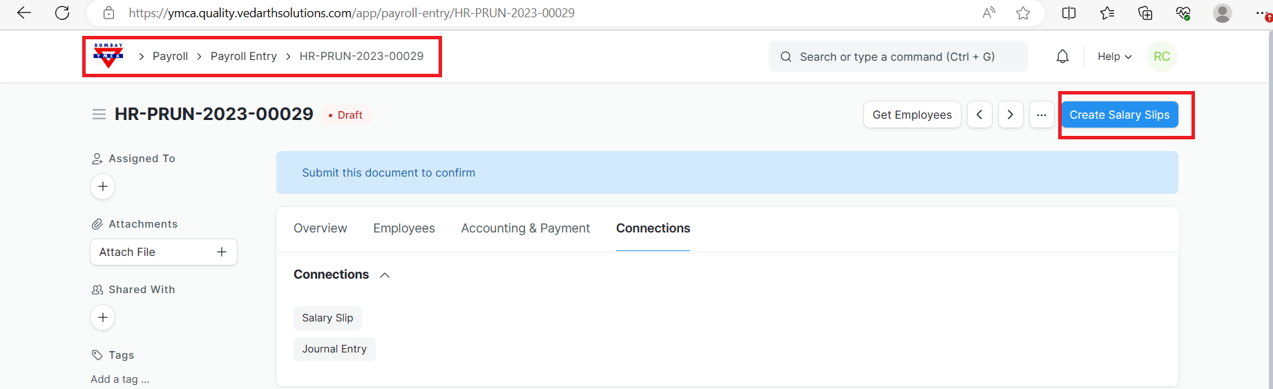 5.Once the list of Employees is fetched, click on the Create Salary Slips button to generate Salary Slips.