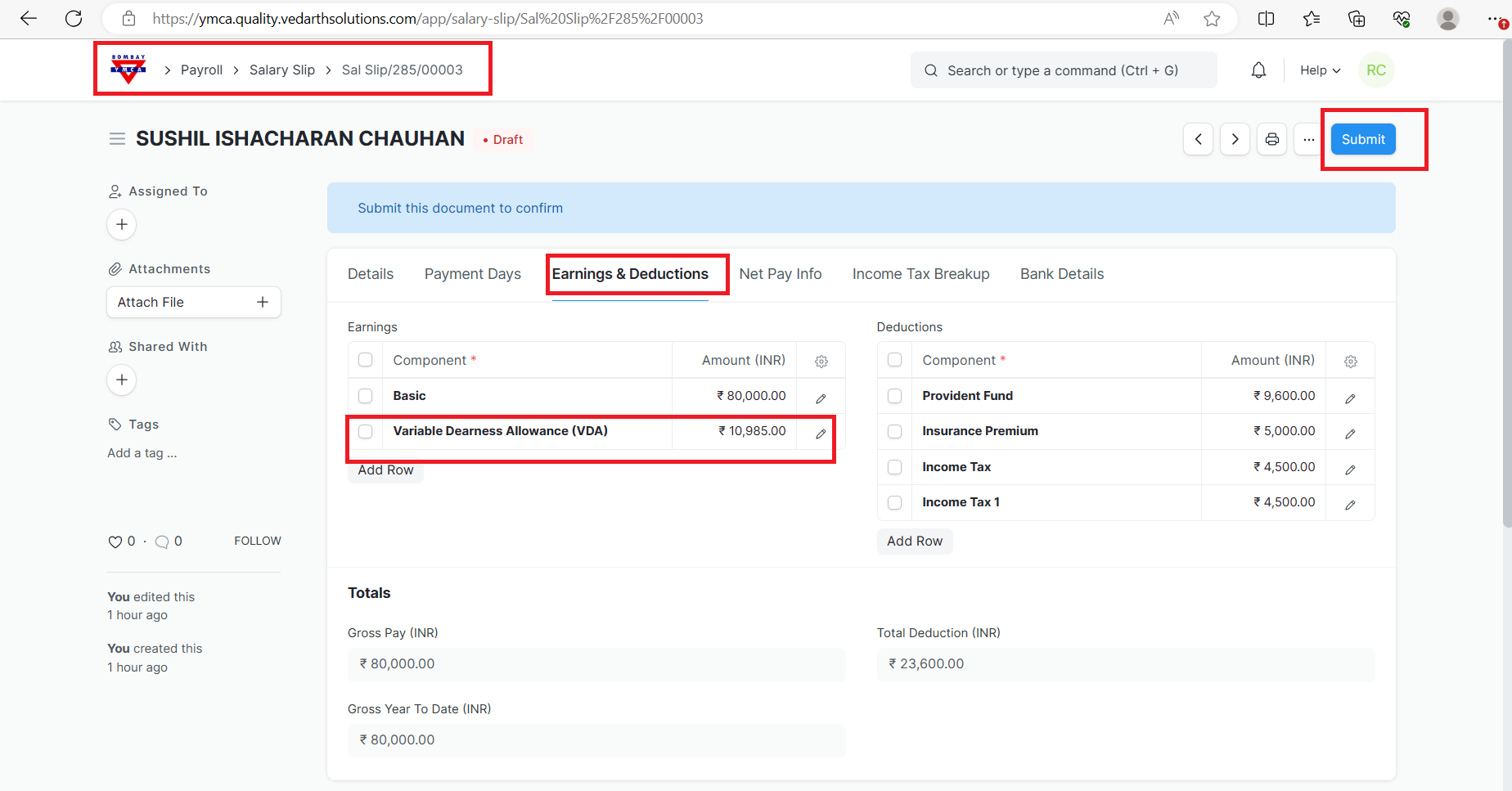 Bombay YMCA - VDA Component in salary Slip